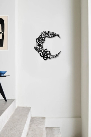 çiçekli Ay Metal Tablo - Oturma Odası Ve Salon Için Dekoratif Tablo - 54X59 Cm