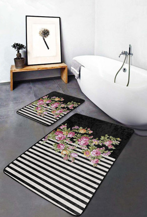 Çiçekli Siyah-Beyaz Çizgili 2'Li Kaymaz Taban Yıkanabilir Banyo Paspas Takımı