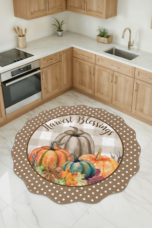 Sonbahar Temalı Kabak Desenli Özel Kesim Yuvarlak Yıkanabilir Kaymaz Taban Mutfak Halısı