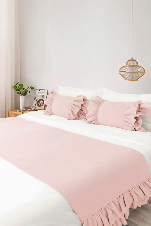 Yatak Runner & Iç Dolgulu Kırlent Seti Çift Kişilik Fırfırlı Pembe, Çeyiz, Yatak Örtüsü