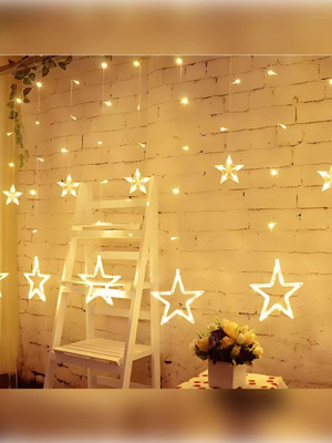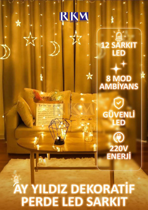 Dekoratif 8 Fonksiyonlu Ay Yıldız Perde Led Gün Işığı Ramazan Süsleme Işık Hilal Yıldız 12 Saçak Led