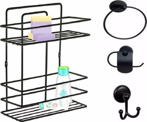 Banyo Aksesuar Seti 4 Lü SİYAH , Ömür Boyu Paslanmaz Düz Banyo Rafı Şampuanlık SİYAH TŞ-02