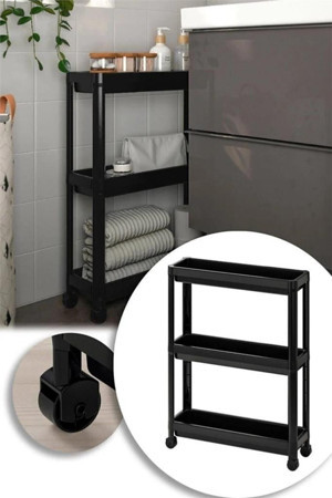 Tekerlekli Dikdörtgen 3 Katlı Raf Ünitesi - Banyo Mutfak Düzenleyici Organizer Siyah