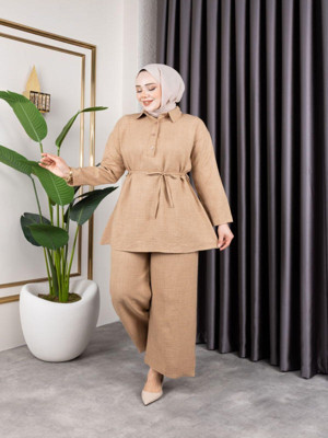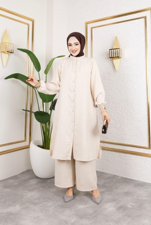 Kadın Tesettür Giyim Hakim Yaka Ve Önü Düğmeli Pantalonu Cepli İkili Keten Takım Bej 46