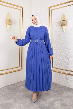 Kadın Bisiklet Yaka,Kolu Lastikli Ve Kemerli Şık Piliseli Keten Elbise Mavi S