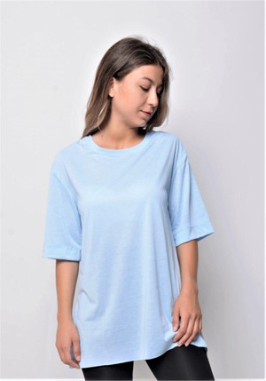 Kadın Düz Uzun Ve Yırtmaçlı Duble Kol Önü Baskısız T-Shirt Ve Tunik Bebe Mavisi L