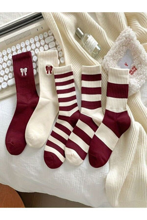 5'Li Ekonomik Paket Bordo-Beyaz Çizgili Kurdele Desenli Unisex Tenis Çorap Seti