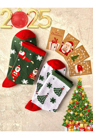 2'Li Yılbaşı Ağaç Noel Baba Christmas Desenli Hediyelik Kartlı Set Unisex Pamuklu Tenis Kolej Çorap