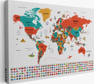 Ülke Başkentli ve Bayraklı İngilizce Dünya Haritası Dekoratif Kanvas Tablo, Duvar Dekoru 1923