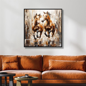 Tablosan Yağlı Boya Dokulu Tablo Koşan Kahverengi Atlar Siyah Çerçeveli U04025