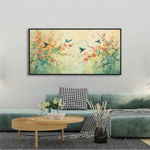 Tablosan Yağlı Boya Dokulu Tablo Bahar Çiçekleri Ve Sinek Kuşları Siyah Çerçeveli U04027