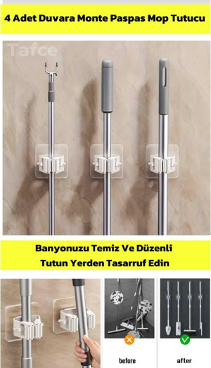 4 Adet Pratik Fırça Mop Askısı Süpürge Paspas Tutucu Mutfak Ve Banyo Askısı Set Renkli