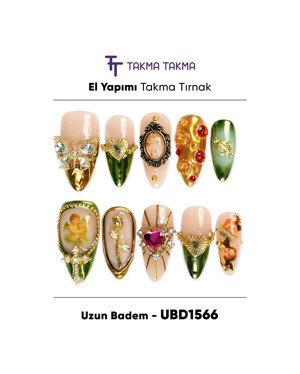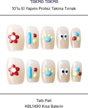 10'lu Renkli Uzun Badem UBD1566 Tekrar Kullanılabilir El Yapımı Protez Takma Tırnak Renkli-L