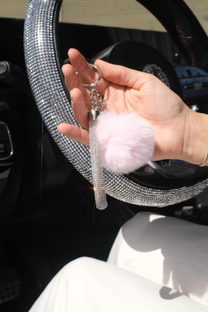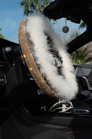 Gold Taşlı Krem Tüylü Araba Direksiyon Kılıfı-Taş Direksiyon