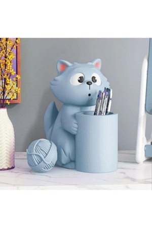 Mavi Sevimli Şaşkın Kedicik Dekoratif Masa Üstü Kalemlik, Makyaj Fırçalığı, Düzenleyici