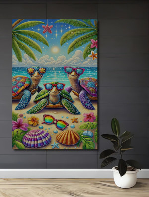 Paradise Beach Kaplumbağaları Dekoratif Ahşap Mdf Dikdörtgen Ev,İşyeri Duvar Tablo