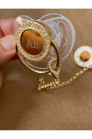İsme Özel Altın Kaplama Zirkon Taşlı Bebek Emzik Seti (0-6 Ay) | Silikon & Damaklı Şeffaf