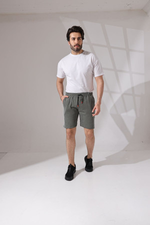 Erkek Regular Fit Haki Çizgili Pamuklu Yazlık Şort