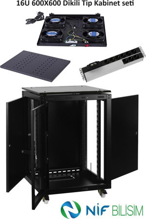 16U 600X600 Dikili Tip Kabinet seti Tekerlek Takımı 4lü Fan 9lu Priz Sabit Raf Dahil Set