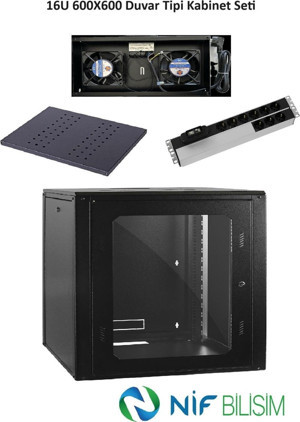 16U 600X600 Duvar Tip Kabinet seti 2li Duvar Tipi Fan 9lu PDU Priz 600mm Sabit Raf Dahil Set