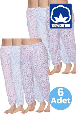 Kadın %100 Pamuklu Desenli Emprime Lastikli Uzun Pijama Lastik Paçalı Don 6'Lı Set Beyaz 3XL