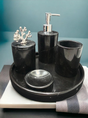 Urestone Mermer Siyah 5 Parça Banyo Seti-Tepsi-Katı-Sıvı Sabunluk-Diş Fırçalık-Pamukluk