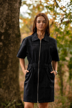 VerdeBlanco Gömlek Yaka Cep Detaylı Boydan Fermuarlı Kot Elbise Siyah