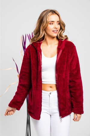 Kadın Bordo Uzun Fermuarlı Kapüşonlu Polar Hırka