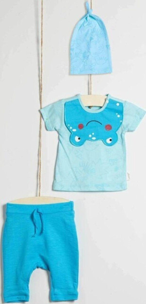 Erkek Bebek 3 Parça Kurbağa Nakışlı Mavi Renk Takım 125698
