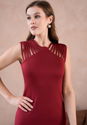 Kadın Bordo Dalgıç Kumaş Biye Tasarımlı Kolsuz Midi Kalem Elbise 2387