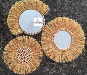 Dekoratif Aynalı Duvar Süsü 3'Lü Rafya Seti Ayna