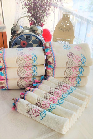 Annem Çeyizlik 50X90 Cm. Kanaviçe Çiçek Desenli Püsküllü Kadife Lüks Havlu Seti 6'Lı Set