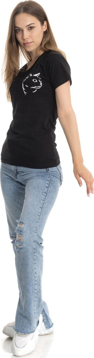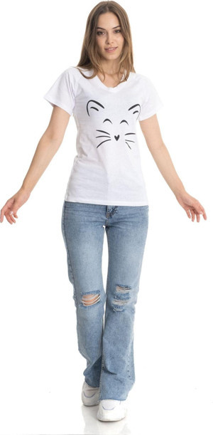 Zümrüt Şaziye V Yaka Kedi Figürlü Beyaz Kadın Tişört