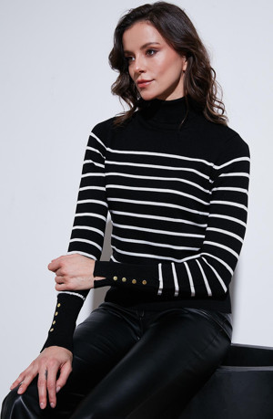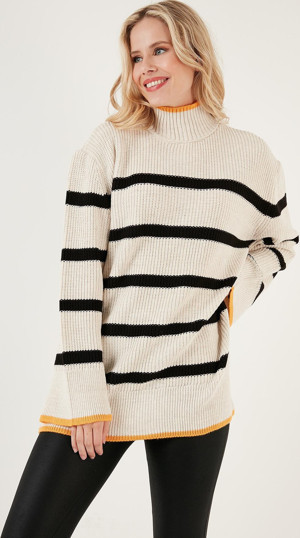 Lela Çizgili Balıkçı Yaka Geniş Kollu Örme Bayan Kazak 4615144 KREM-SİYAH