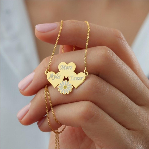 Üç isim detayı ile kişisel anlam taşıyan bu kolye, özel günlerde veya günlük kullanım için idealdir