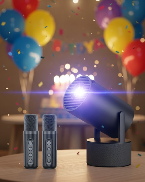 Modern siyah tasarımı ile estetik görünüm sunan bu karaoke projeksiyon sistemi, ev partileri, doğum günleri ve aile eğlenceleri için ideal bir çözümdür.