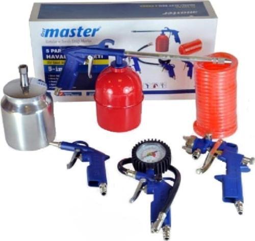 5 parça havalı alet seti Içerik; -boya tabancası; Nozzle: 1,5 mm Basınç: 45-50 psi Hava tüketimi: 5cfm@40psi -lastik şişirme tabancası; Kapasite: 0-150psi -hava tabancası; Basınç: 45-75psi Hava tüketimi:5cfm@40psi -spiral hortum; Uzunluk: 4 metre Maksimum basınç: 170psi -mazot tabancası; Basınç: 30-55psi Hava tüketimi: 3,5cfm@30psi