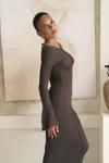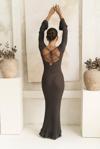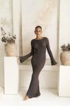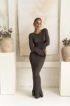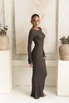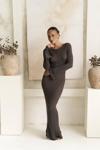 Bambu, uzun boy, boyundan bağlama detaylı triko elbise. Kolları uzun ve şerit çerçeveli. Etek ucu kalın ip şerit detaylı özel tasarım.