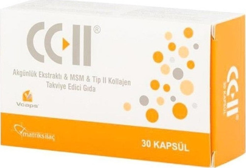 Cc Iı Takviye Edici Gıda 30 Kapsül Ürün Markası: Matriks Ürün Boyutu: 30 Kapsül Özet Bilgi: Takviye Edici Gıda İçerik: Msm(Metil Sülfetil Metan) (38.12), Bitkisel Kapsül (Hidroksi Propil Metil Selüloz), Akgünlük Ekstraktı (19.06), Maltadekstrin, Tip Iı Kollajen ( 1.9), Stabilizatör ( Yağ Asitlerinin Magnezyum Tozları (E270b) 1 Kapsüldeki Günlük Miktar: Msm……………………..……200mg Akgünlük Ekstraktı………100mg Tip Iı Kollajen……………….10mg
