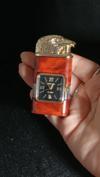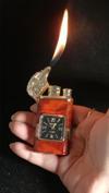Bu özel tasarım çakmak, şık maun (ahşap) görünümlü gövdesi ve üst kısmındaki detaylı altın renkli kartal başı figürü ile güçlü bir duruş sergiler. Üzerindeki entegre kuvars saat sayesinde her an zamanı takip edebilirsiniz.