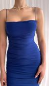 Bu zarif mavi büzgülü midi abiye elbise, özel günlerinizde şıklığınızı ve zarafetinizi sergilemek için tasarlanmıştır. İnce askıları ve drapeli büzgü detayları ile modern ve göz alıcı bir görünüm sunar. Özellikle düğünler, mezuniyet törenleri ve diğer özel davetler için ideal bir seçimdir.