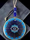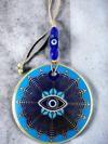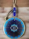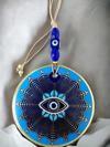 Nazar boncuklu göz duvar süsümüz nazar boncuğu ile süslenmiştir. Ürünümüz mavi cam nazar boncuğundan tamamen el işçiliği ile üretilmiştir. Ürünümüzün yuvarlak kısmı 13 santimetre çapındadır. Duvar süsümüz ip dahil yaklaşık 30 santimetre boyundadır.