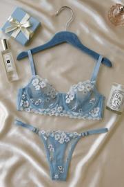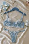 - Zarif mavi çiçek işlemeleriyle süslenmiş transparan dantel sütyen ve string takım, şıklığınızı geceye taşır.; - %90 polyester ve %10 elastan karışımı materyali sayesinde esnek yapısıyla konforlu bir kullanım sunar.; - Çiçek desenleriyle feminen dokunuşları ön plana çıkaran bu takım, stilinizi tamamlamanız için idealdir.; - Maksimum 30 derecede elde yıkama ve asarak kurutma önerisi ile uzun ömürlü kullanım sağlar.; - Dantel dokuması ile göz alıcı bir görünüm kazandırırken, tanga alt silueti rahatlık sunar.; - İki parçadan oluşan set iç giyiminize pratiklik katar; her anınıza uyum sağlayacak şekilde tasarlanmıştır.; - Esnek yapısı sayesinde vücut hatlarınıza mükemmel uyum sağlayarak konforlu bir deneyim yaşatır.; - Balensiz üst silueti ile doğal göğüs şekline sahip olanlar için idealdir; bralette kesimiyle modern bir tarz yaratır.; - Askılı kol boyu sayesinde omuzlarda hafiflik hissi vererek rahat hareket etme olanağı tanır.; - Her mevsime hitap eden tasarım özellikleriyle yılın her zamanında tercih edebilirsiniz.; - Kapsız kap yapısıyla minimalizmi benimseyenler için uygundur; çıtçıtlı kapama şekli kolay kullanım imkanı sunar.