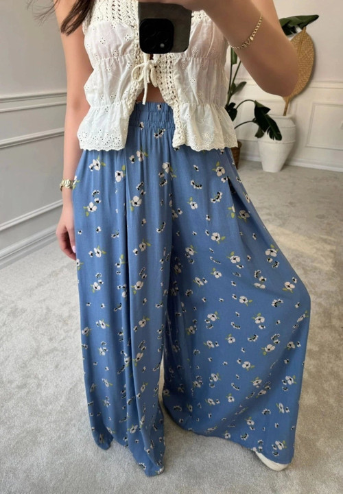 Mavi Desenli Bol Paça Şalvar Kadın Pantolon
