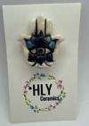 Koruyucu sembollerden ilham alınarak tasarlanan Mavi El Seramik Yaka İğnesi, el formu ve ortasındaki nazar detaylarıyla dikkat çeker.
