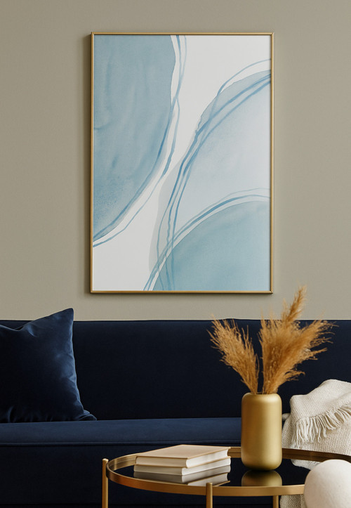 Mavi İzler Abstract Modern Tablo - Gerçek Cama Baskı Gold Alüminyum Metal Çerçeveli Tekli