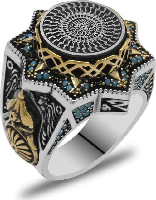 Mavi Kehribar Üzerine Hüsn-i Hat 33 Besmele-i Şerif Yazılı Yıldız Tasarım 925 Ayar Gümüş Erkek Yüzük