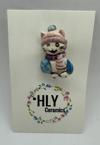 Mavi montu ve pembe beresiyle renk uyumuyla öne çıkan bu kedi, el yapımı detaylarıyla dikkat çeker.