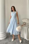 Mavi Yanları Büzgülü Midi Boy Keten Elbise