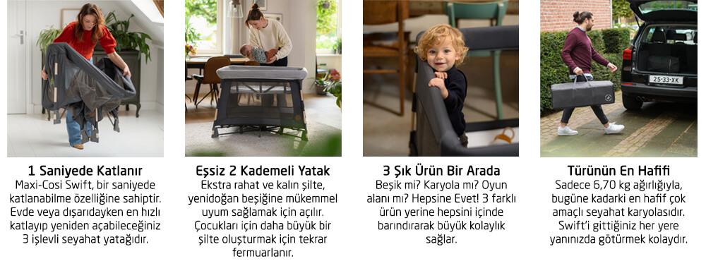 Maxi-Cosi Swift ile tanışın! Maxi-Cosi Swift, yenidoğan beşiği, karyola ve oyun alanı olarak kullanılabilen çok amaçlı, şık 3 işlevli seyahat yatağıdır.